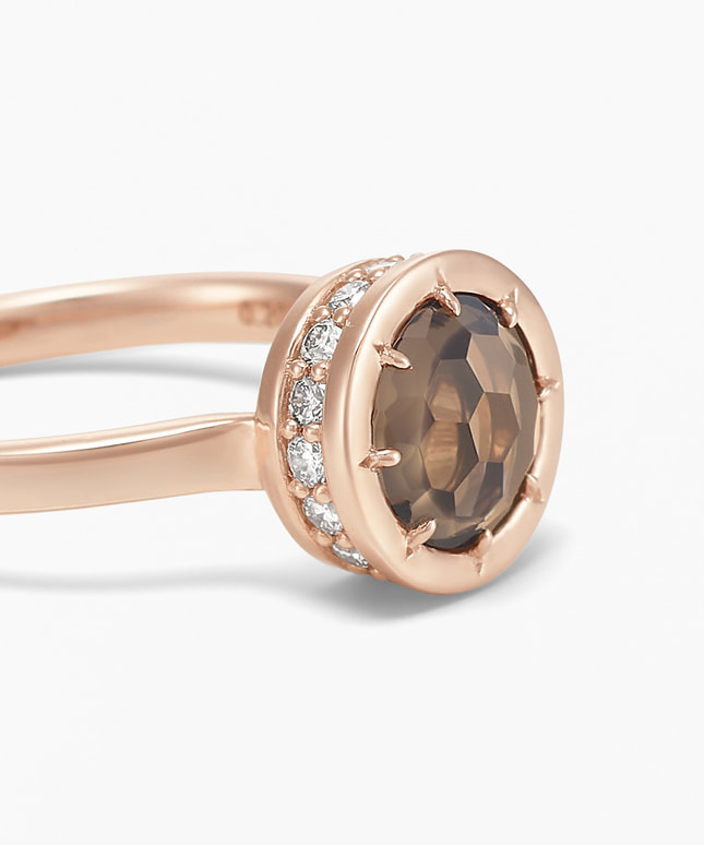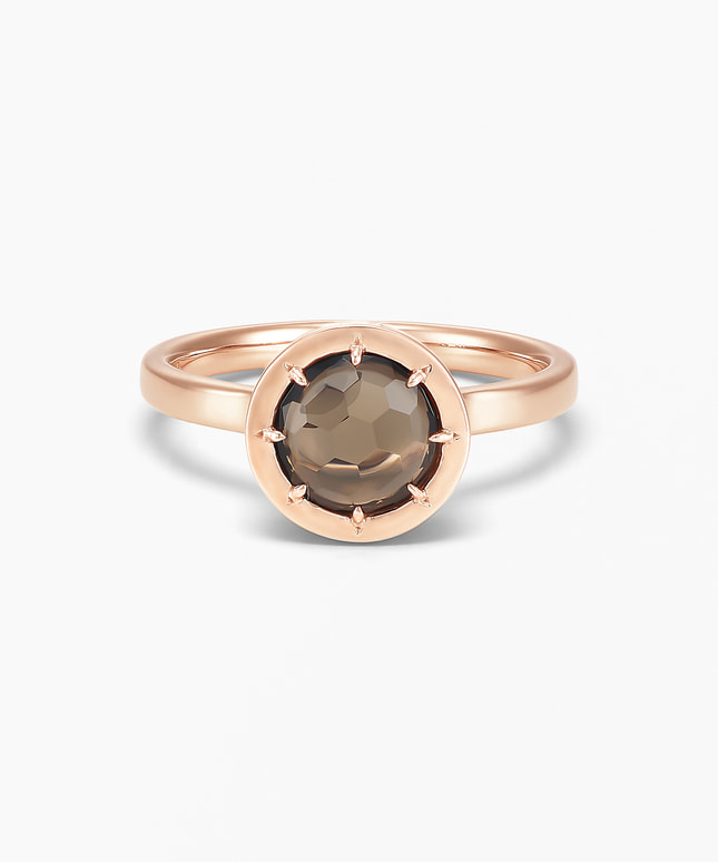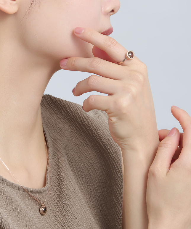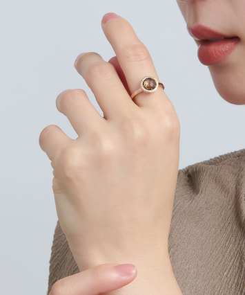 ■デザインについて たくさんの人が集まる宴のポジティブなエネルギーをイメージして創られたリングです。 大切な人とのつながりで生まれる温かさや始まりや区切りを祝う身の引き締まる気持ちをいつも心に、という想いを込めました。 シンプルなデザインながらも、側面には地金の色に合わせた16個のダイヤモンドをあしらい、華やかさを演出。 メインストーンのスモーキークォーツは「大地の力を宿す石」と言われていて、精神を安定させて落ち着きを得られると考えられています。 地金のピンクゴールドとの組み合わせにより、上品さと温かみを感じさせてくれるデザインです。 ■スタッフのおすすめポイント ・スモーキークォーツは魔除けや厄除けとしても知られ、お守りジュエリーとしておすすめ。 ・正面は落ち着いた印象、斜めから見ると華やかさが引き立ち、角度によって表情が変わるデザイン。 ・同じシリーズのネックレスともコーディネートを楽しむことができます。 ■カラー・素材の展開 メインストーンは8種類を展開。 こちらのスモーキークォーツの枠と地金にはK14のピンクゴールドを使用しています。 ■同シリーズのアイテムはこちら