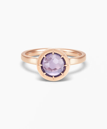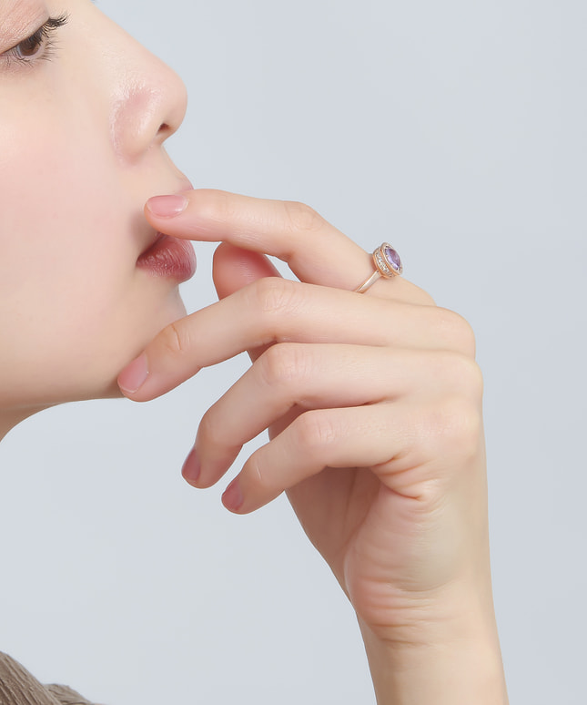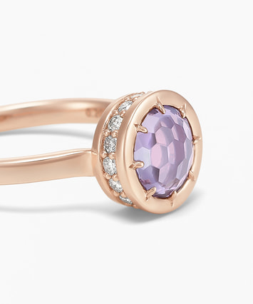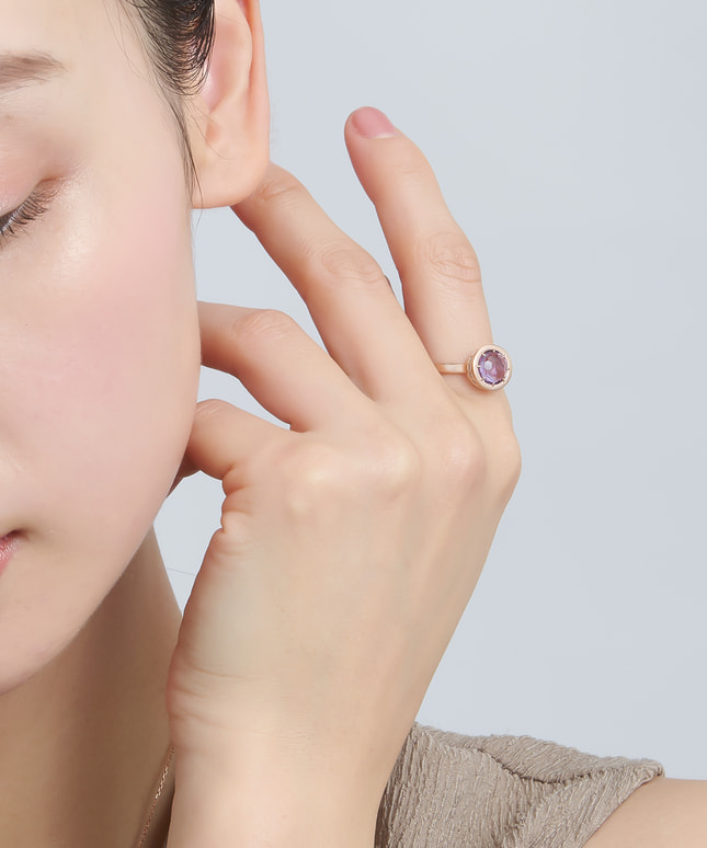 ■デザインについて たくさんの人が集まる宴のポジティブなエネルギーをイメージして創られたリングです。 一見シンプルなデザインですが、側面には16個もの天然ダイヤモンドが連なっており高級感が漂います。 メインストーンのアメシストは天然石の透明感のある高貴な紫色で精神的な安定と癒しを象徴しています。 感情を鎮める癒しの効果のほか、直観力を高める効果もあると言われています。 ■スタッフのおすすめポイント ・アメシストは古代ギリシャ語の「酔わせない」が語源。お酒で失敗したくない夜に身に着けたいリングです! ・8種類のメインストーンの中から、ピンとくるジュエリーをぜひ見つけてみてください ・同じストーンのネックレスとリングでコーディネートしたり、ご自身のお気に入りの組み合わせを楽しむのもおしゃれです。 ■カラー・素材の展開 メインストーンは8種類を展開。 こちらのアメシストの枠とチェーンにはK14のピンクゴールドを使用しています。 ■同シリーズのアイテムはこちら